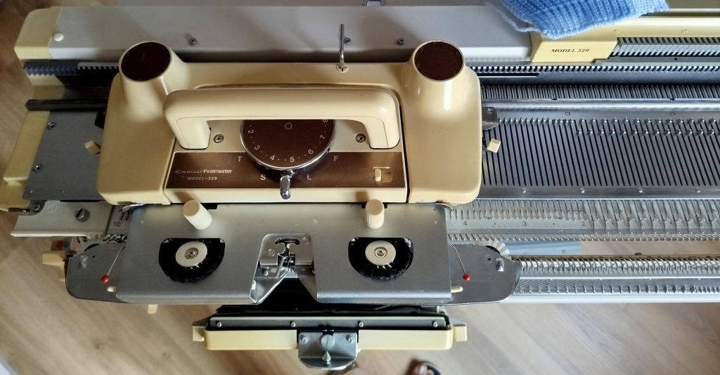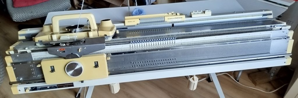 Elle tricote les fils moyens et la grosse laine (grosseur de laine : 3.5 à 7) – Fonture longue : 150 aiguilles – Voir descriptif complet de la machine ici